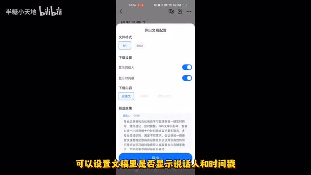 可以设置文稿里是否显示说话人和时间戳。