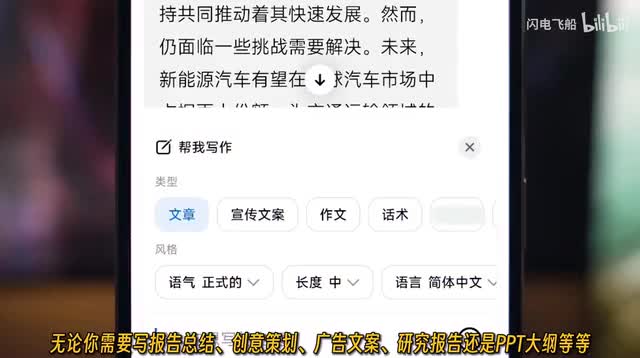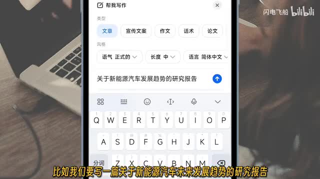 现在在手机上打开豆包a p p,想写啥直接告诉他就行。比如我们要写一篇关于新能源汽车未来发展趋势的研究报告,这样输入语气写作篇幅的长短和语言还可以选择。