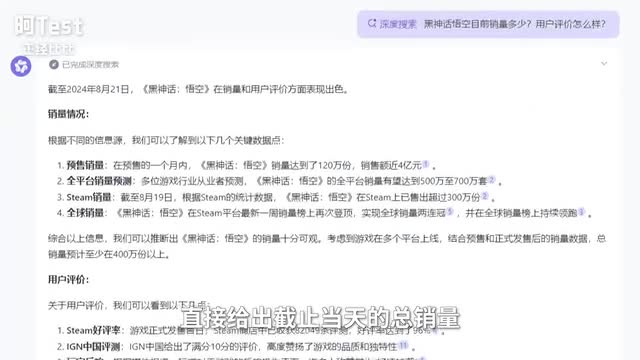 而用传统搜索还要依赖眼力脑力去刷网页、查找信息、筛选总结。借助a i搜索呢,比如最近更新的通义,就可以直接像跟同事对话一样,直接提问题就有答案了。包括我问通义黑神话悟空目前销量多少,用户评价怎么样?他就快速学习了十个相关网页,直接给出截至当天的总销量、总销售额以及媒体反馈。想要更详细的信息,它还能深度搜索,给出预售销量、全平台销量,预测各平台的评价和好评率,甚至列举了i g n u s的具体评论。二十多个网页,从理解问题到搜索到整理成答案,十几二十秒就能完成。