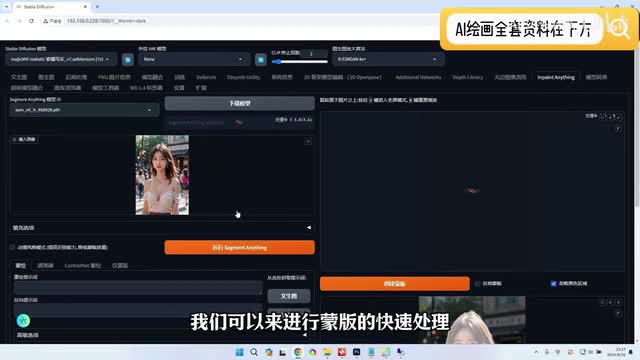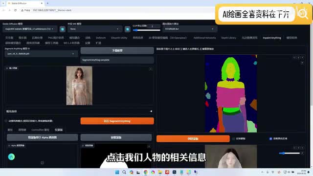 好,进入到我们stable definition软件当中的话呢,第一步我们先找到鹰派的n n c这个插件。通过这个插件的话呢,将我们现在原片投入到我们的一个图像当中,点击运行去识别我们的画面信息。呃,通过这个插件我们可以来进行门板的快速处理,呃,并不需要photoshop这样的一个专业工具。好,来到旁边的色块图当中,我们点击头发,点击人物面部的一些内容,然后点击创建门板。好,这个时候的话呢呃我们有一些瑕疵,可以通过进一步的一个修剪。
