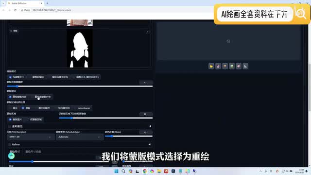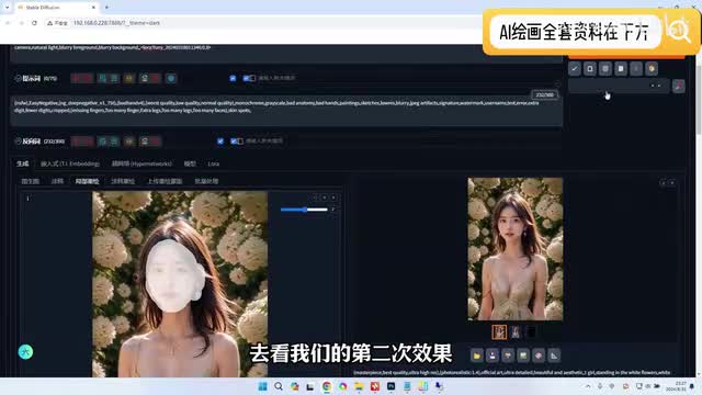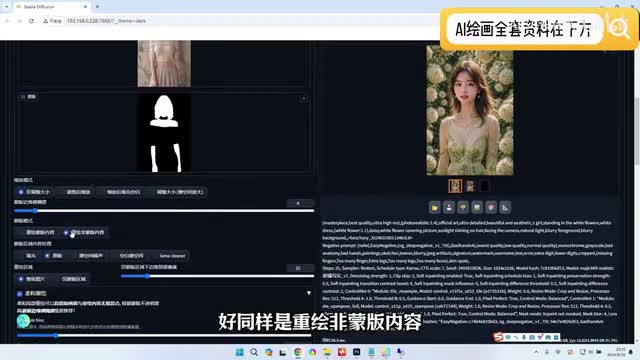 呃,同时的话其中增加了一个花朵主题的loa。反向题词的话呢我们选择一些常用的反向提示词。呃,如果没有好的题词的小伙伴,可以在评论区当中留言来进行获取。好,接下来的话呢我们检查一下先生参数,我们将门板模式选择为重绘非门板内容,同时我们开启柔和重绘。采样方式的话呢,我们选择最新的run style采样,同时我们的采样步数我们调整到二十步左右即可。