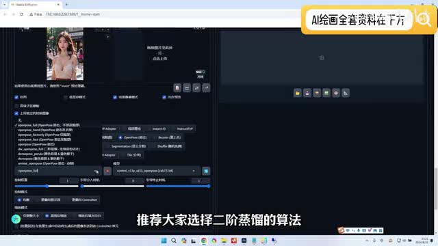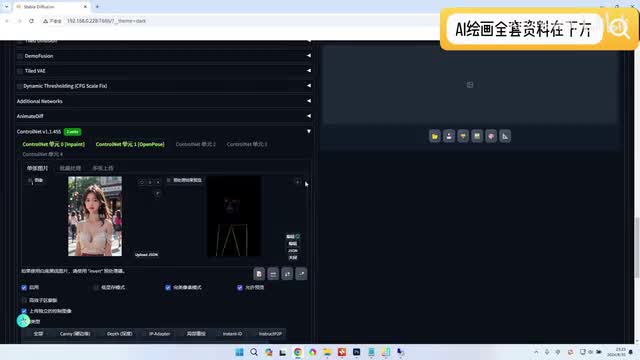 这一步的话呢,我们要点击上传独立控制图像。将我们的原图拖入到我们的一个图像区,点击允许预览,开启我们的open pose选项。这个时候预处理器的话呢,推荐大家选择二阶蒸馏的算法。点击爆炸图标进行运行。这个时候我们已经看到预处理出来的骨骼图,呃,其中有非常多的背景当中,路人的一个骨骼被识别出来。