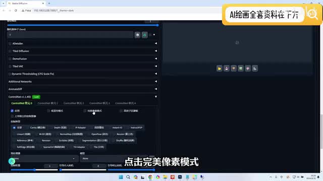 点击我们的三角板,同步我们的一个图片宽高,将我们的重绘幅度拉低。接下来我们找到control,点开我们的control。点击启用,点击完美像素模式。第一个选项我们点击局部重绘,选择局部重绘的第三个预处理方式啊,重绘全局融合算法。接下来我们开启一个新的controller单元,点击启用,点击完美像素模式。