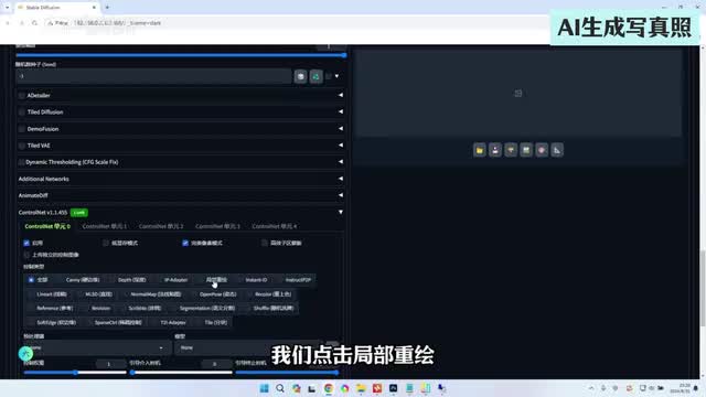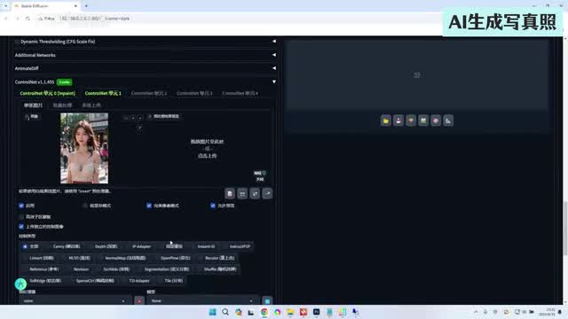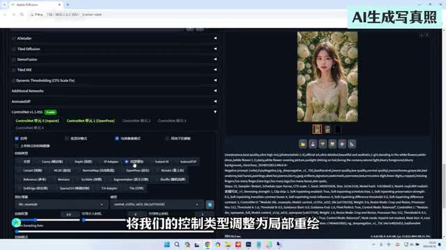 同样是从会费门板内容。好,保留我们的整个的一个选项,不需要变。好,接下来的话呢还是重复将我们的控制类型调整为局部。这里我们open pose,依旧选择d w傲基。好,我们点击生成来测试一下效果。