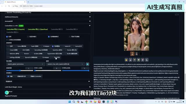 我们来到康加尔当中,点击取消我们的上传独立控制图像,将我们的原图作为我们的一个控制来源,保留open pod和d w的二阶处理方式。接下来我们将局部重绘的控制类型改为我们的他要分块。将我们的菜肴分派权重调整到零点六左右。同样点击生成去看我们的第二次效果。好,我们这个时候第二次的一个身份结果已经出来了。