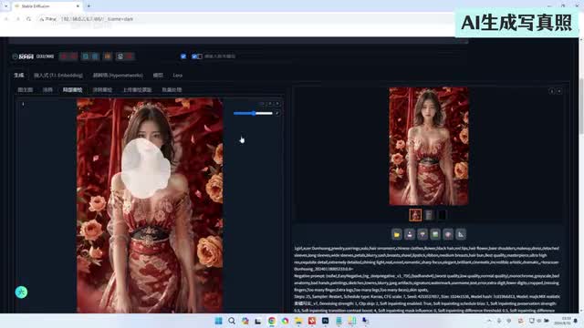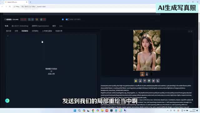 好的,这个时候我们已经生成了第一次的一个效果,这个是以花朵为主题的写真效果。当然画面当中出现了一些小的瑕疵啊,但是不用着急,接下来的话我们会对这一张效果图进行二次的一个处理,让它的细节和光影得到进一步的一个完善。接下来后呢我们选择这一个效果图发送到我们的局部重绘当中啊,点击通入到局部重绘。这个时候我们选择用画笔将我们的一个脸部信息进行一个涂抹。好,涂抹好脸部信息之后的话呢,我们来到下方和检查下我们的一个生成参数和其他的一个参数都不需要做变动。