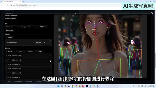 这时候我们已经看到预处理出来的骨骼图,呃,其中有非常多的背景当中,路人的一个谷歌被识别出来。我们点击编辑小程。在这里,我们将多余的骨骼图进行去除。不当的调整一下我们的骨骼图,点击发送到contact当中。确认好抗衰like之后的话呢,我们可以点击生成来查看我们的一个效果。