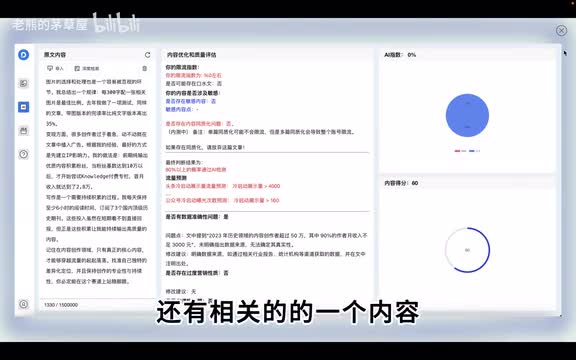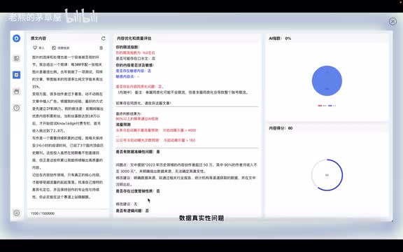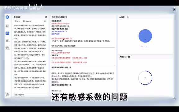 大家可以看到我这样的方法有哪些技巧呢?可以看到通过这样的方法,我可以知道我的一个啊暗线流指数的问题,还有口水纹的问题,还有敏感系数的问题,还有同质化的问题。还有能检测出我这篇文章是不是ai生成的,大家看的是能标记我是不是ai生成的,ai创作的比例是多少。还能够进行一个冷启动的流量预测。