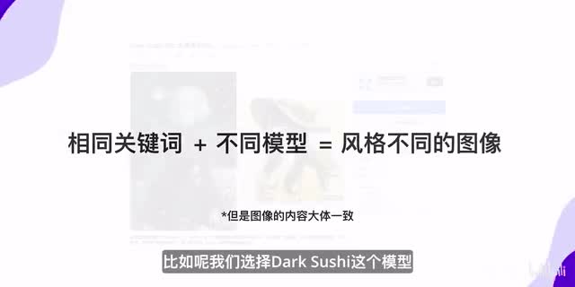 我们只需要知道,只要载入相对应的模型就可以生成类似模型中的图片。输入相同的关键词,选择不同的模型,生成的风格也是不同的。比如呢我们选择dark sushi这个模型,生成的图像风格是这样这样和这样的。又比如我们选择一个比较写实的模型,生成的风格是这样这样和这样。
