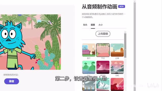 第一步选择画面大小,这次我们准备做的视频是横屏选择youtube。第二步设置背景和人物,这个视频的主题是讲如何做披萨饼,要跟视频的主题契合,那就选咖啡屋做背景。