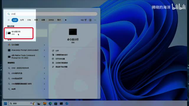 安装好之后,我们点击左下角windows开始图标。在搜索框中输入c m d,打开命令行提示符。输入欧拉马尔软前卫二点五。只需要这一个命令,就能把模型自动下载并运行起来。