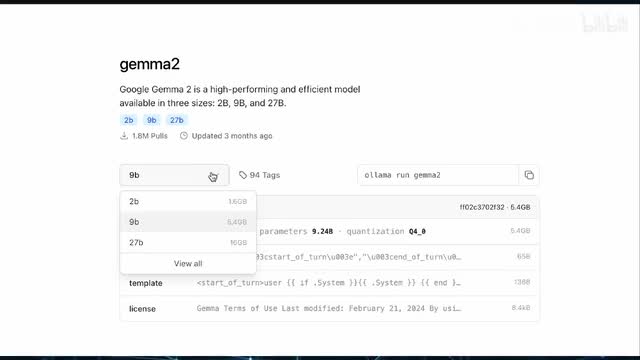 恭喜你已经成功部署了第二个大模型。这里要知道的是,同一个模型也会有不同的参数版本。在选择模型时,我们会看到不同的参数版本。比如这个b指的就是billion,也就是十亿的意思。