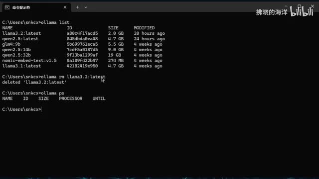 欧拉玛list可以展示出你已经下载过的模型。欧拉曼r m模型的名称可以删除这个模型。欧拉玛p s查询当前正在运行的模型。当然,欧拉玛的指令不止这些,我们可以输入欧拉玛来了解更多的指令信息。
