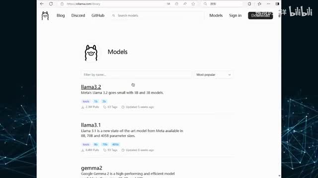 首先我们回到欧拉玛官网,点击。这个列表中有上百种模型可以供我们选择。这里我们以蓝网三点为例,点击模型名称,进入模型详情页面。点击这个按钮,复制运行命令,在命令控制台执行。