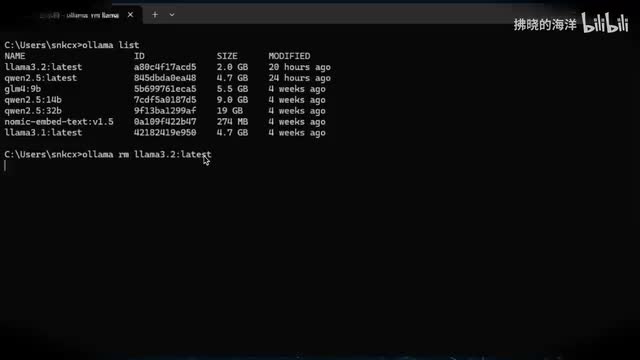 所以当我们看到二十七b时,就表示这个模型有二百七十亿个参数。通常来说参数量越大,模型能力就越强。当然对我们的电脑的要求也就越高。除了我们刚才用到的欧拉玛run,这里我们再介绍三个重要的指令,以便能让你更好的管理和使用你的欧拉玛。