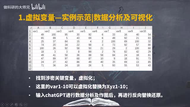 像我们比如说我们我们这是我们的一个实验数据。我这里随便举了一个例子啊,比如十行十列对吧?那这里关键变量是什么?关键变量就是你每一列的这个列名,对吧?这个就是你这个呃你你的一个检测的一个指标一个指标嘛,对吧?比如说第一组是什么?第二组是什么?第三组是什么?o k你这里就把这个变量v这个v呃v a r一到十虚拟化替换替换为这个x y z一到十,对吧?这样的话你即使把这个表格数据上传到了这个t i g p t上。用这个code interpreter去做这个数据分析以及可视化。别人并不知道你上传的,他只是知道你一个数据。但如果这个数据没有清晰的变量的定义,那这个数据没有任何意义,对吧?这样的话即使他拿了你这个数据,他并不知道你的你的数据背后指的是什么东西。他即使分析出来了,对他就不知道要拿这个数据去写个什么样的文章,对吧?这样你就不用担心了ok。
