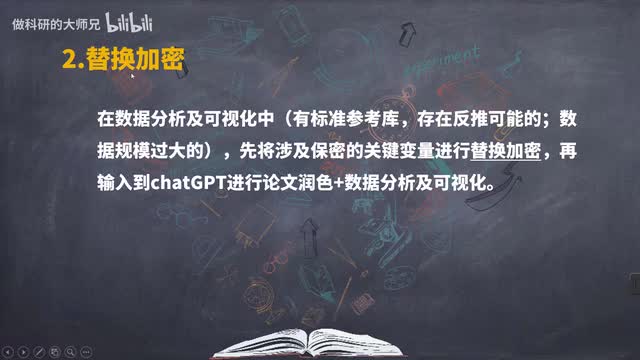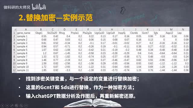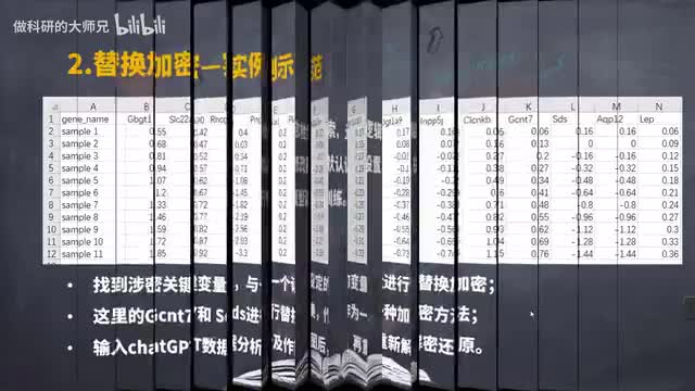 当你这样一样的用用这个chat g p t分析之后,你最后把它给你导出来的分析以及做的图哎反向进行还原,还原回到你之前的变量啊,这样是不是就可以很好的保证了你的数据的一个安全性。好,我们第二种方法就替换加密啊。替换加密的方法其实跟这个我们第一种呃这里讲的这个虚拟变量的一个方法,本质上其实是差不多的那我们为什么单独把它给拎出来呢?啊,那主要是我们啊在这里啊是在这种特定的条件下啊,就是比如说我们在进行数据分析以及数据做图的过程中,对吧?比如说比如说你那个数据啊,你有标准的参考库,什么意思呢?就比如说呃比如说你你你这个数据里面有一百列,对吧?但是这一百列的变量它有个参考库,你只是改变了其中某一个。把它某一个虚拟化了啊,这样的话就会导致什么?导致你。导致你这个。别人可以反推,能够反推到你那个已经虚拟化的变量是什么,对吧?具体是什我待会儿也会举一个实例告诉大家啊,跟大家做一下展示。