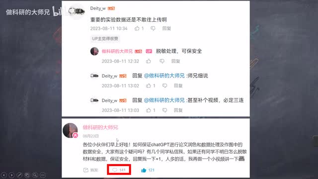 因为他怕自己的实验数据就是没有发表,但是也被泄露出去,这样导致他自己的文章发不出去对吧?还有一个就是刚才我们讲的就是就是上面这个k m idea对吧?就是你自己去想了一些很好的idea,结果你就是在利用其他的g p t的去实现这些idea的过程中,你又怕他被泄露出去。ok今天嗯我们针对的主要的一个问题就是呃我给大家提供三个小技巧啊,三个小方法去很好的去避免我们上面所讲到的这一个数据安全问题啊。嗯,当然了,关于这个数据安全的一个忧虑吧,我也在b站上啊发了一条动态,然后征集大家的一个意见啊。发现这也有不少的同学啊,关于这个使用chat g p t中来做科研的过程中啊,都存在一些就是数据安全方面的一个忧虑,对吧?好呃,我今天就给大家分享一个三个方法吧,来避免你在使用chat g p t做科研的过程中,你的一个数据的一个泄密啊。其实三个方法是也很简单,但是。呃,因为我统计发现很多同学并不知道啊,这所以说我就。