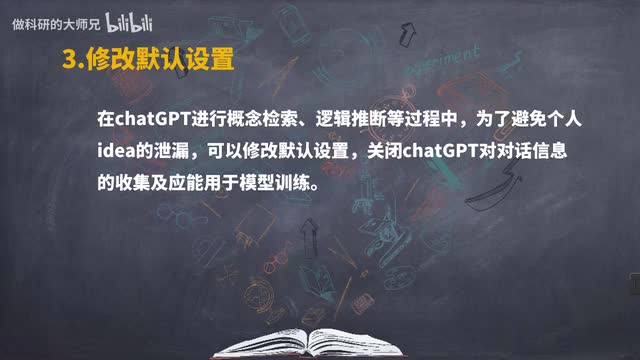 第三种方法是指什么?什么时候我们去需要用到呢?就是比如说你并不是用chat g p t进行这个啊数据分析,也没有用用它来进行这样一个论文润色,你只是用它来进行一些。比如说概念的一些检索,比如说进行一些逻辑的一些推断,就是帮你去呃找到一些潜在的一些科研的idea,对吧?这个过程中我们想如果你没有进行一些额外的设置的话,你在chat g p t中的所有的对话都会被这个chat g p t所收取,而且也可能用于它模型的一个训练。这样的话你这你你想到的就是你你你给他提问的过程啊,他就会收集信息。就有可能把你去关联到的一些idea给泄露出去,对吧?这个时候我们我针对这个问题我们怎么解决呢?我们只需要一个啊就修改一下默认设置啊,关闭chat g p t它对话信息的一个收集,以及不要不让他用我们的对话信息来进行模型训练,对吧?这个怎么做?非常简单的一个啊,你改一下它的默认设置啊,方法就这里了啊。我们进入那个界面之后啊,我们这里跟大家来具体看一下吧。这样一个一个一个就是。