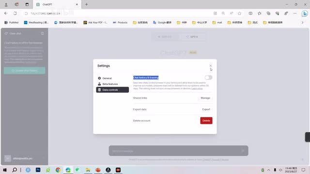 p p t它的一个界面,对吧?你进入这样一个设置啊设置。设置之后,这里有一个data c control啊,这里你看一下它这里一个。呃,chat history and training啊,你把这个按钮关掉啊,ok. 关掉之后,你看它这里就不再会收集,以及不再记录你。现在去。咨询的一些东西了,对吧?这个时候什么时候用呢?有的同学可能觉得。哎呀,我关掉历史记录好像不太方便啊,没没问题啊。