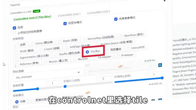 好,我们上传这个图,在control net里选择till重绘幅度改成零点三,这样我们的光影能更融合。