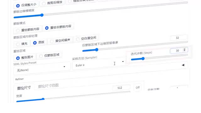 蒙版边缘模糊度时,选择重绘妃蒙版内容迭代步数三十采样方法,选择自己需要的调整图片宽高尺寸,重绘幅度改成一。