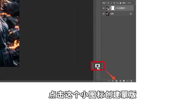 这时候我们打开p s把a i图放在第一个图层,原图放第二个图层,点击这个小图标创建蒙版,选择画笔工具,在脸部、手部等地方轻轻涂抹一下,这样我们一张a i摄影图就做好了。