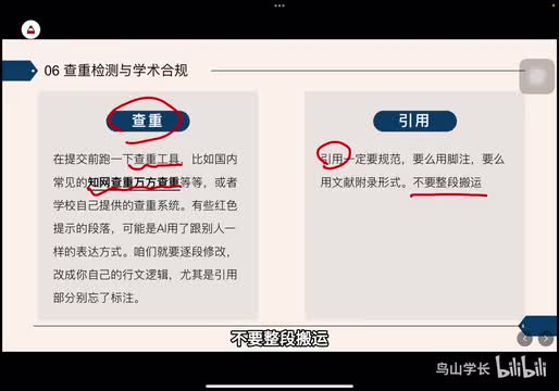 注意查重。在提交前一定要查重啊,比如知网、万方等等啊,很多查重的工具,你自己要查一查啊,另外引用一定要规范,不要整段搬运。下面。你现在已经有很多的a i检测工具来检测你的论文是不是像机器人写的。如果整篇都是a i帮你写,那很容易就被检测出来了,没有必要。