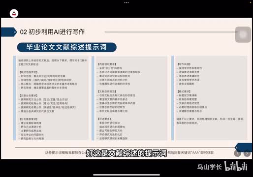 好,下面。当你确定完题目之后,你要干什么?你要确定你论文的大纲。那么大缸的提示词是什么呢?是这个啊从文章结构、内容深度、论证方式、语言风格、目标读者定位等等啊,让他给你生成一篇符合你的论文标题的学术论文大纲。那么需要注意什么呢?一可以让他给你两到三套甚至更多不同的提纲,再根据你个人的思路或者你导师的意见来做定制化的拼接和调整。另外在文献综述方面,如果你之前已经下载汇总了相关文献,那就可以告诉他这个提示词啊,这个只是提示词的角度,下面具体提示词我会给到大家啊。
