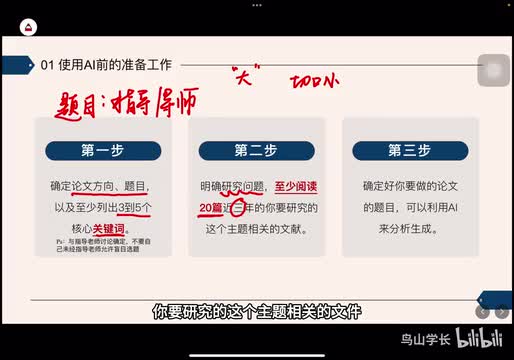 指导一个学生的论文的时候,那个学生就自己选的,选的太大了,导致他写出来的东西全都是空话和套话,最后答辩了两次才通过。所以大家在选题的时候尽量选择切口要小,切口要小。第二步是当你明确了研究问题之后,你去至少阅读二十篇近三年的你要研究的这个主题相关的文件。这个需要你自己踏踏实实的去读,去输入啊去输入。如果没有这个输入的过程,当ai辅助你进行创作的时候,你完全不知道他给你写的东西是不是符合你的要求的,是不是和你这个主题相关的,他的逻辑是不是有问题呢?你全都不知道,那就抓瞎了。