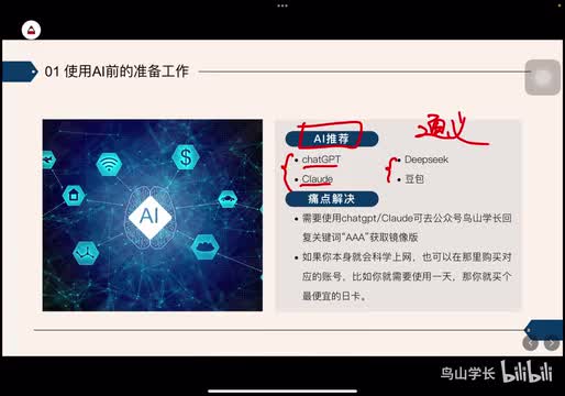 这就是一个迭代的过程,你就和他正常的对话就可以了。好,下面准备工作a i的推荐啊,我个人首推这两个,就是chat g p t和cloud。那么国内的是这两个dpa sic或者豆包,或者阿里的通义也可以。那么痛点在哪儿呢?如果你需要使用这两个的那你就不会科学上网,那你就去公众号鸟山学长回复关键词a a获取镜像吧。如果你本身就会科学上网,也可以在那个地方去购买对应的账号啊,也可以拼,也可以自己买一个单独的,反正这个你自己按需取用都ok啊,都ok。