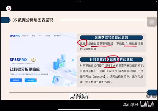 另外数据必须由你自己获取和验证,不能让a i编或者把假设数据值当真。那还有就是针对调查问卷数据分析的建议。如果你不知道啊怎么用s p s s去分析调查问卷的数据,两个角度,一你可以啊用它来描述需求出图。二是使用这个网站叫smart pro或者s p s s a u啊,他们都比较简单啊,没有什么学习成本,便于数据处理和作图。如果你需要用的,你自己去搜一下就可以了。
