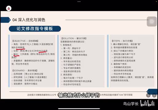 下面是深入的优化和润色,下面我会给大家一个提示词。这个提示词的意思基本就是让他扮演某某专业的一个专家,为你修改论文的某某段落输出格式是什么什么样子的啊,大概就这个样子,说你将作为什么什么领域的专家教授修改论文里面的中文段落啊,输出格式什么样子的。具体情境解决方案以及执行步骤啊,你可以直接把它复制给他,然后把括号里面的内容替换成你的那个主题,或者你的那个题目,或者你需要的那个领域就可以了。另外,你也可以让他帮你检查整篇论文的结构。你可以让他告诉你论文的逻辑有什么改进的地方,哪些章节可以合并等等。