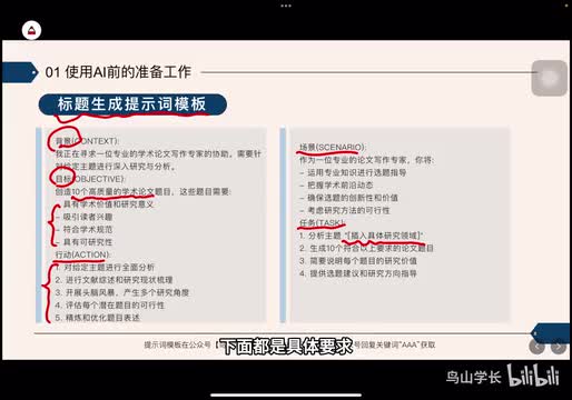 从背景、行动场景和任务啊,在这里你插入你具体的研究领域就可以了。你可以看到我们的目标是什么呢?啊,创造十个高质量的学术论文题目,啊,这是他们的具体要求啊,下面都是具体要求。当然你也不用抄啊,也不用截图。提示词模板我已经放到了公主号鸟山学长。如果需要的朋友你去关注之后,回复关键词a a a就可以获取了。