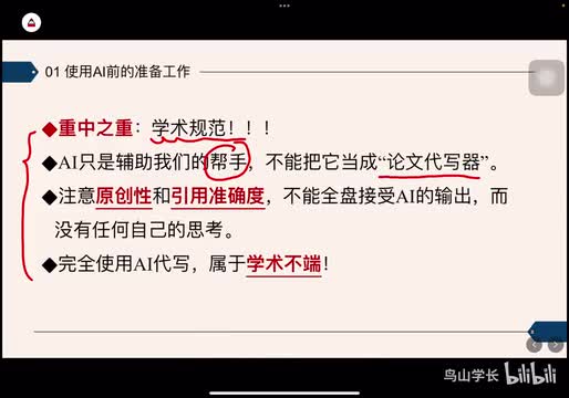 首先第一部分,写作步骤及相关提示词的模板。首先我必须强调以下四个点。第一个点是注意学术规范,a i只是辅助我们的帮手,不能把它当成论文代写器。第二要注意原创性和引用的准确度,不能全盘接受a i的输出,而没有任何自己的思考。第三,完全使用a i代写属于学术不端啊,这是我要提醒大家的。