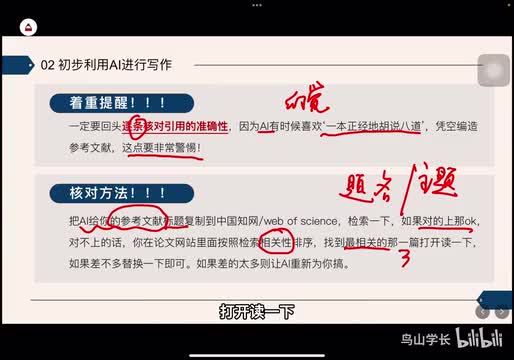 核对方法是什么呢?就是把a i给你的参考文献的标题复制到中国知网或者web one science啊,用题名去检索一下,当然或者你用主题检索也可以啊。如果对得上,ok如果对不上,你在论文网站里面按照检索的相关性去排序,找到最相关的那一篇或者那几篇,打开读一下。如果哎发现差不多,那你替换一下参考文献就可以了。如果差的太多,你就让他重新给你搞,或者你自己进行调整。再下一步就是写初稿啊,你可以从研究背景再到后面的提示词,从目标情境解决方案再到具体步骤。