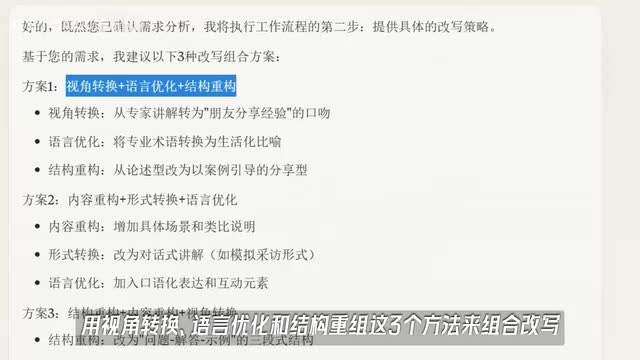 他不光要告诉你选哪个好,而且还会具体解释为什么这个组合最适合你的需求。比如说我这个地方,他建议我用到方案一,用视角转换源优化和结构重组这三个方法来组合改写。因为这个更加适合视频文案的一种表达方式。好,我选到一,然后他就会马上给出方案一的一个改写大纲,从结构到具体的修改点。