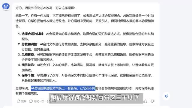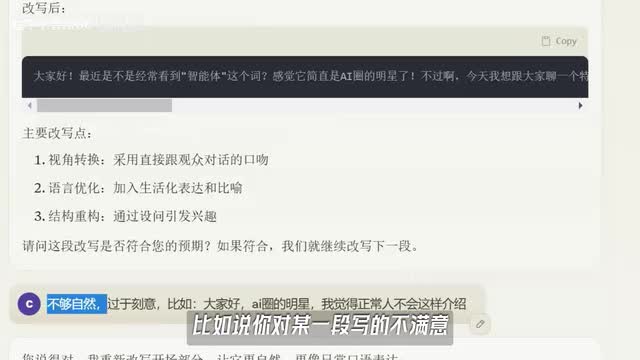 并且这个地方大家看到还列出了主要的改写标注,写的很清楚。那么等大纲确认之后,我们就可以开始真正的改写了。比如说你对某一段写的不满意,那我们直接可以让他对照第一步的这个要求重新优化就可以了。好,最后重头戏来了,我们来对比看一下这两篇文章的一个区别。