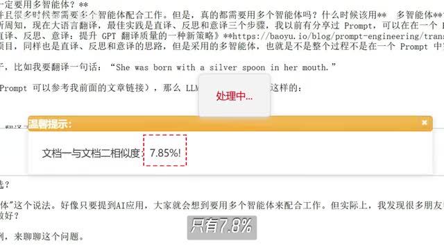 没错,右边这篇是a i写的。看上去这两篇文章的这个核心内容完全一致,但是他们的表现手法与风格却完全不同。最后检测出来的这个相似度只有百分之七点八,其中的原因呢就是我纠正了根本性的偏差。我花了两周的时间研究出了这套a i改写提示词只需要五个步骤,三分钟,你就能轻松利用ai实现任何文章文体的改写。