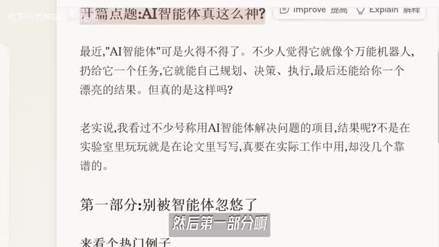 你干嘛?啊。ok第一步把这套提示词先发给a i那接下来他会提醒你上传你的原始内容。那我这儿呢就以这篇内容作为我们的一个实操案例,我点击发送给a i然后第二步大家可以看到它紧接着就开始分析这篇文章它的各方面要素了。比如主要的观点是什么?用了哪些关键的数据,价值主张是什么?目标受众是什么?啊,你看a i分析的很到位,这个地方核心观点主要就是讲a i应用的关键在于设计适合ai的工作流,而不是过度依赖ai智能体的这个概念很准确。第三步呢,a i它就会基于上面的这个分析提出改进空间,相当于就是在这一步找到不足的地方或者创新的点,以此作为二创文章的优化方向。