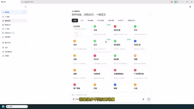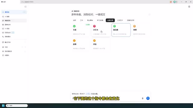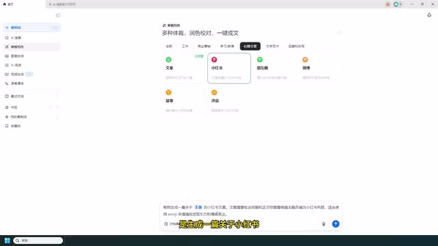 可以看一下这个帮我写作里面它是有很多种这个题材的,就是很多不同应用场景。在这里我们选择这个社媒文章,然后我们点击这个小红书。