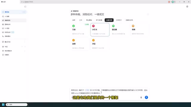 可以看一下,在这里我点击这个小红书,它下面就生成了这个文案框架,就是帮我生成关于。某个主题的小红书文案,文案需要包含标题正文,标题需要根据主题改编为小红书风格。