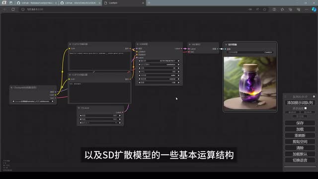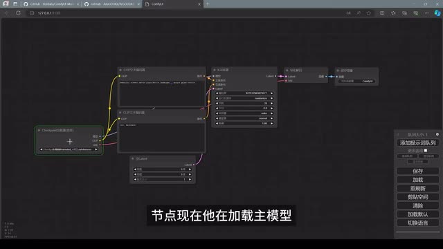 那么现在我们的汉化问题也解决了之后呢,我们在这里随便选择一个模型,可以看到它自动就识别到我们刚才设置的stable division的check point的主模型的文件路径了啊,这里我们还是选择一个曾经的一个模型,这就是一个简单的提示生成工作流。选择一个模型,我们直接点击右边的添加提示词队列,也就是生成我们的当前图像。点击一下。那这个流程它是用绿色框框选出来的节点,现在正在加载主模型,第一次加载可能会比较慢啊,那么加载完以后它会进行文本的输入。最后呢它会在这个采样器这边来进行一个综合的采样和图片的渲染。那么最后呢它会解码,解完码以后呢,会给到我们这边图像一个保存和生成。所以通过这样节点生成的方式呢,我们可以清晰的明白它的工作流程是怎么样一步一步一步一步的来完成,最终呢实现我们这个图像生成的。