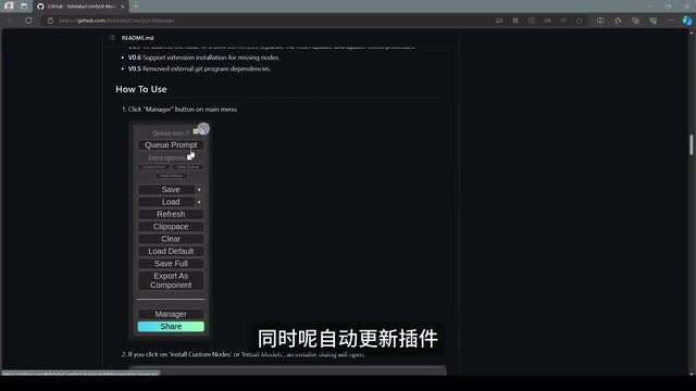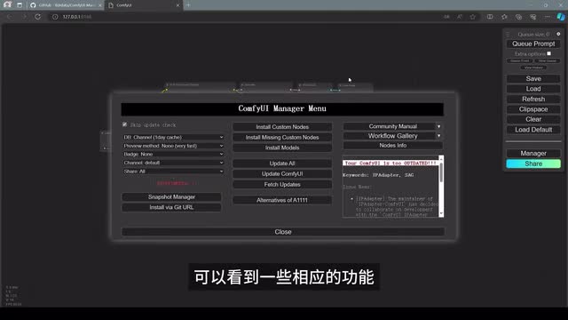 其他的插件旁边可以看到这有一系列的按键指令啊。我们只要需要按住control,然后推滚轮,我们可以把它缩小一点点,放在旁边进行一个浮油窗这样一种方式,这是我习惯这样做啊,可以看到下面有个manager,这就是我们刚才安装这个插件的功能,它就会多这么一个选项了。那我们点开它以后可以看到一些相应的功能。就比如说安装插件,安装模型,然后升级我们的conf u i或者是升级所有的内容,那这就是它的一个便捷性了。那么接下来我们再安装插件,就可以通过这样的方式来安装了。比如说我们选第一个install custom notes,安装自定义的节点,也就相当于安装插件。看到右边我们可以搜索我们想要的插件。