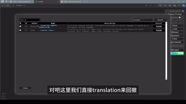 这里同样给我们列了一个插件列表,可以看到无数啊很多集合了conf u i用到的所有的插件之后我们这么安装。在右边呢我们搜索什么呢?搜索第一个要用的就是translation。啊,这样一个拓展是什么呢?这个translation它就是翻译嘛对吧?啊,界面翻译。那这样的话未来我们学习就很直观很方便的能理解它的一些界面应用对吧?那这里我们直接translation来回车可以看到这里有两个我们选择。第一个啊,我们可以看到它前面的一个前缀是这么一个a打头的前缀,对吧?那这边我们也可以看到这边是a打头的一个前缀,这个地址是没错的。我们点后面的安装啊install来安装一下。现在我们看后台可以看到,它同样执行了get to clone这一个命令啊,相当于它是用可视化的界面把我们执行了这样一个命令了,就这么简单。