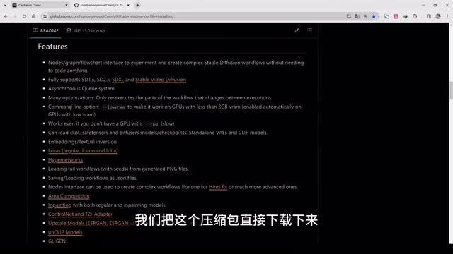所以这才是专业团队一般都选用这个节点式编辑的主要原因呢。那在抗非u i对我们个人而言或者社区而言呢,其实它起到的作用就是更容易进行分享。我们通常都可以把别人现成的工作流导入到我们的p u i的界面里面来,又或者是把某一个功能模块分享出去。那么这一方面呢我觉得才是节点它最大的作用和效果。ok那么简单的了解完以后呢,我们就来进行初步的安装和配置。其实这个过程非常的简单,在这里呢我们也打开了一份咖啡u i的github,其实作者都已经为我们准备好了这个压缩包了。那可以看到这个是对于。