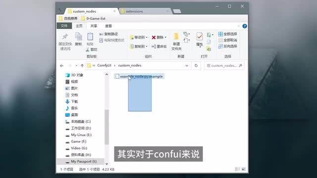 那么说到这儿呢,我们就说到第二点,如何安装。conf u i的插件。同样我们来到conf u i的文件夹下面,像在s d安装插件我们们也都知道了啊,在我们这个extensions拓展里面对吧?如果是在web u i里呢,我们找到下面有一个custom notes自定义节点。其实对于conf u i来说,所有的插件呢大部分的插件都是额外的一些节点。不同的节点为我们提供了不同的功能。当我们想调用更多的功能,但是线性框架下没有这些功能的话怎么办?我们就需要下载额外支持这些功能的节点。所以在这u i里面我们这个插件或者是拓展文件夹,它叫custom notes。