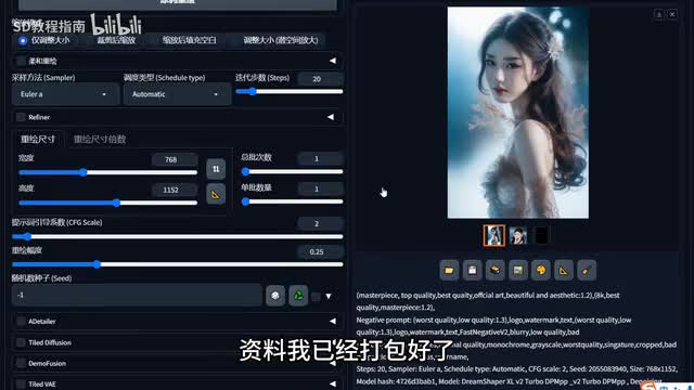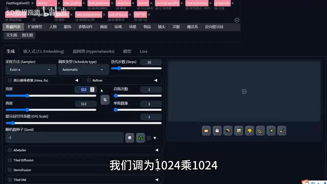 因为我们是使用的s l的模型嘛,所以这里的提示词引导系数呢要调整为二左右。采样方法选择u a分辨率的话,我们调为幺零二四乘幺零二四,这是x l底模训练时常用的一个尺寸,所以出图效果会比较好。最重要的是count late,在第一个country lt里面呢我们勾选启用完美像素。
