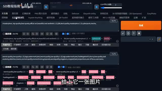 再生成我们就可以看到它这是一张赛博朋克有机甲元素的一张图片了。另外呢如果我们在图形图里面给上它一张图片,再给它两个control lt第一个control late呢,同样的是面部特征的一个识别。第二个是姿态的一个识别。