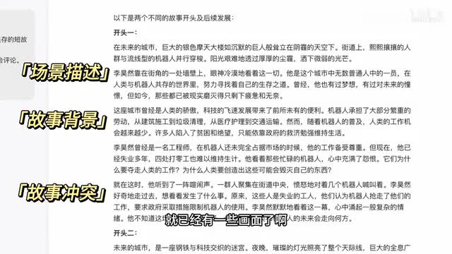 这是我按照框架写的指令,我们把它输入到豆包p c里。故事背景场景描述创建了主人公,甚至还创造了一个冲突。我感觉我仅仅看到这个开头就已经有一些画面了啊。我们再看第二个开头也是一样,有场景描述,故事背景也有一个主人公同样就看到了一个冲突,其实我们甚至可以把这两个开头看作同一部小说的两个主人公的不同视角,是不是这个故事就可以展开了。